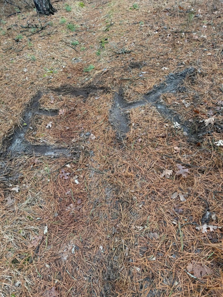 The first day set off without a hitch (literally, my dad dropped me off). I started excited to see what the trail would bring. Well, that excitement turned to frustration when faced with the first hurdle – blowdowns. A blizzard passed through this area 2 weeks ago, dumping well over 18 inches of snow 2 weeks after an ice storm of the century that had only just started to thaw out. The Blizzard of 2026 destroyed many trees who were unable to withstand the weight of the snow. Many of those fallen trees happened to land right in the middle of the trail. Navigating through that was difficult and taxing, but luckily most were easy to pass. I only saw 2 people the entire day and stopped dead in my tracks when I spotted my initials etched into the trail right before my very eyes. Is the Jersey Devil out to get me?! My brain could not comprehend the coincidence until my dad texted me… the jokester did it when coming back home. I have to remind him of the leave no trace principles, ha!
