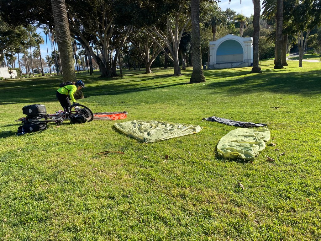 Eventually we got into Santa Barbara and decided that we had to figure out what to do for the night. Our original plan was to have a short ride today to recover from the last few days battling hills on out of shape legs. We were going to treat ourselves to a hotel, but given it’s a big city in SoCal, we wanted to save a few bucks. So we sent out some feelers on Warm Showers and as we waited for responses, set up our wet tents in a local park to dry, receiving lots of dirty looks from passersby.