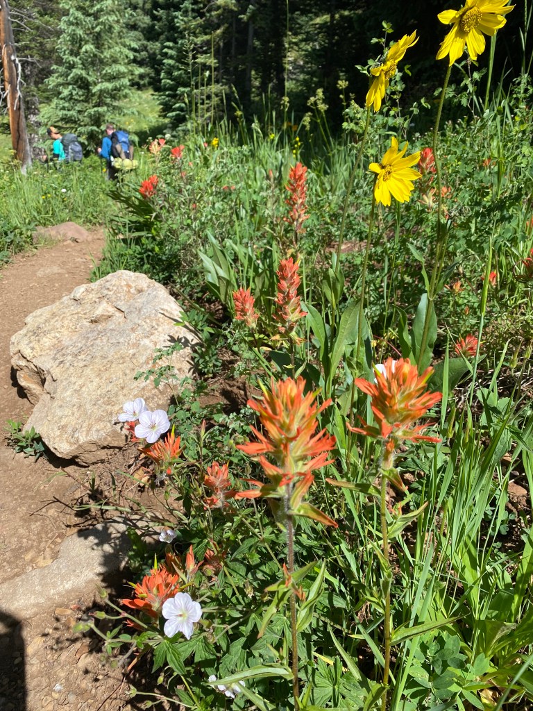 We enjoyed the descent and eventual gradual climb to Frigid Air Pass. There was beauty everywhere we looked. I remember it being stunning four years ago – but not this stunning! Wildflowers were in full bloom, accenting the vibrant green with yellows, magentas, blues, and lavenders. It was dazzling and felt like walking through a field of dreams.
