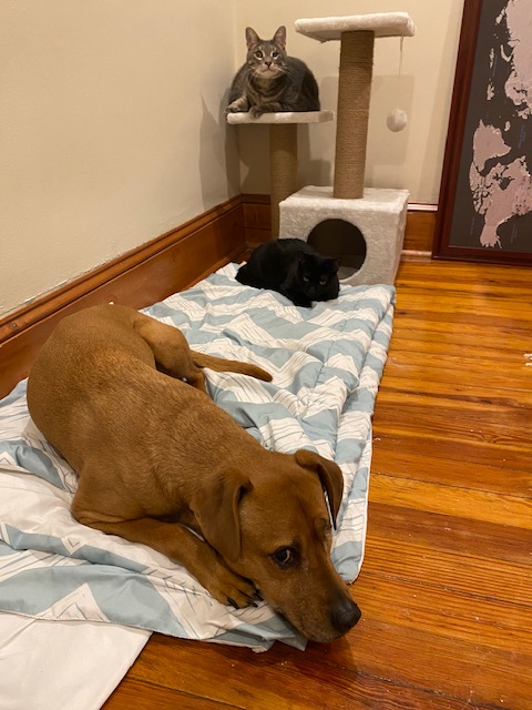 Obligatory pet pic! Missy brooding in the background is the newest member of the Pirate Ship. Missing one leg, she is slowly but surely becoming a defining member of the pack.