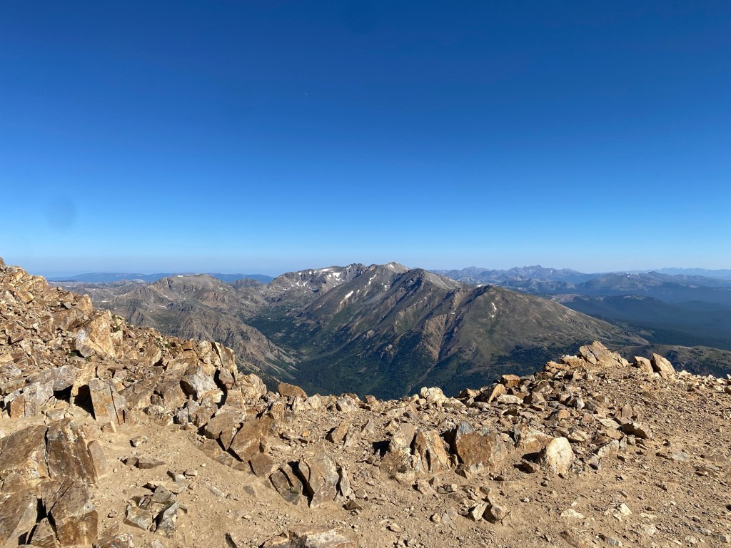 It’s a 10 mile out and back route with over 4k’ of elevation gain to the summit of 14.4k’. And it was every bit as tough as you can imagine! Air is thin up there and there are some hefty stretches of over 22% grade. But with time, rest, and persistence I got up there before 9am. It was the most beautiful day – blue skies, 70 degrees, and no wind! So unusual for being that high, I really picked the right day!