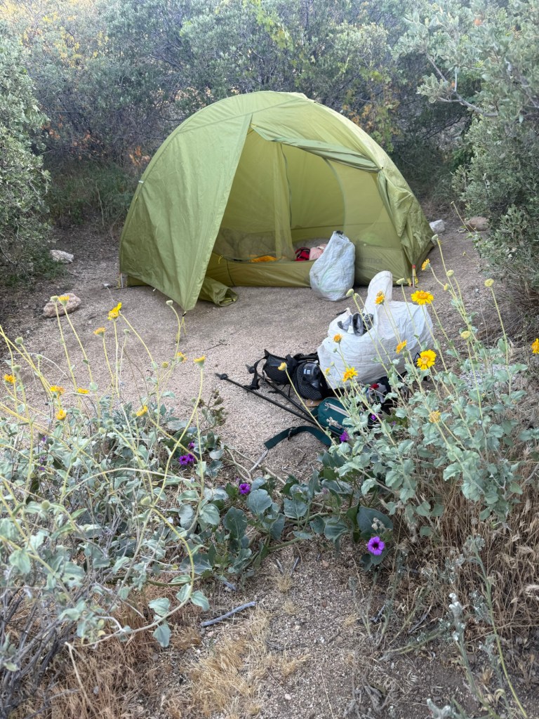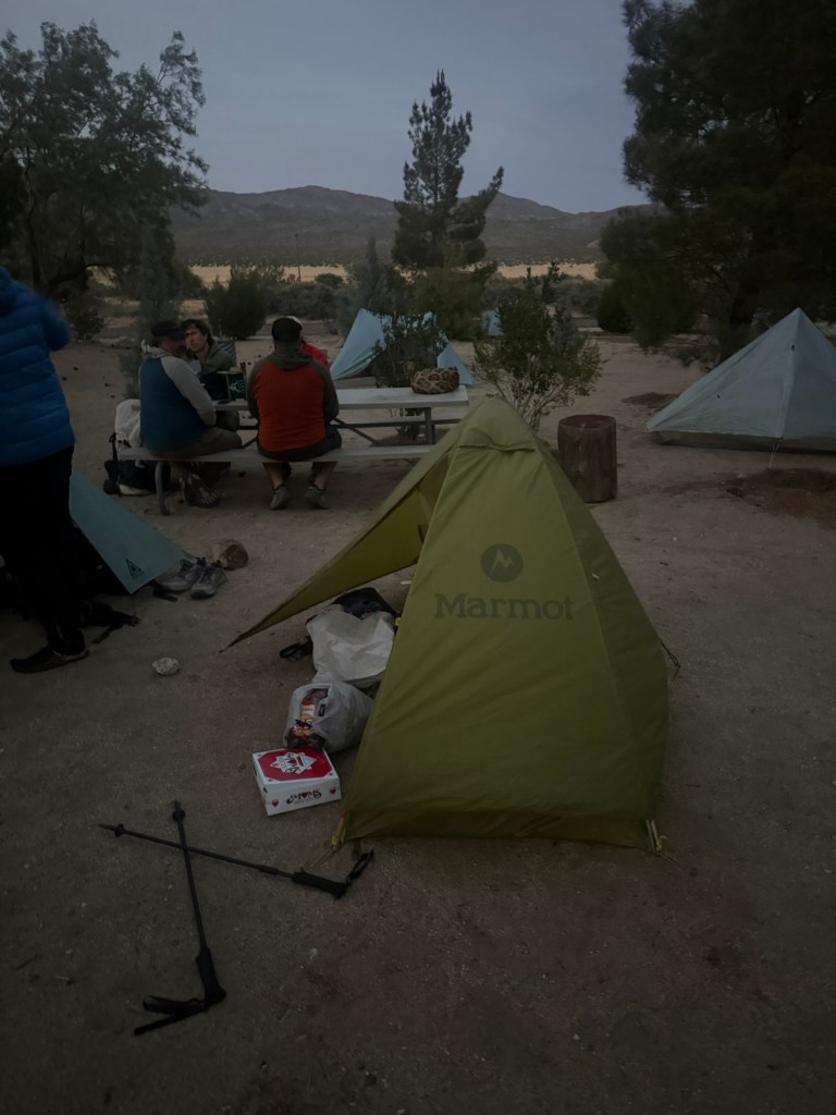 A tale as old as time, we had no intention of going this far today. But after our intended spot was deemed horrible due to exposure during an especially windy day, we decided to keep pushing on to a more protected spot. Small and not ideal, we set up our tents right in the nick of time. It started to rain! Not what I was expecting out here in the desert, but nonetheless I kept dry.