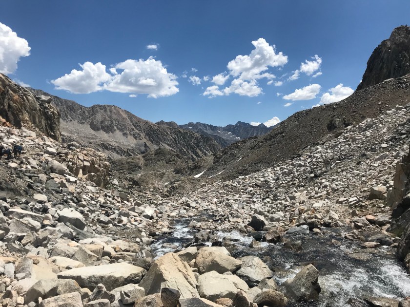 Marybeth woke up this morning feeling better – it’s a Christmas (in July) miracle! We got out relatively early and forded the Evolution Creek before 8am. Doing it early lessened our risk of being taken away by the strong current.  And was it strong. Coming just to below my shorts, I carefully treaded along the wide creek and made it to the other side safely, despite all the creek’s effort to do me in.  We had just under 9 miles to John Muir Rance, where we are resupplying for the second time. All downhill, we got there just around 1pm.