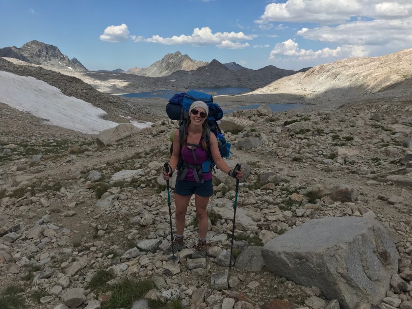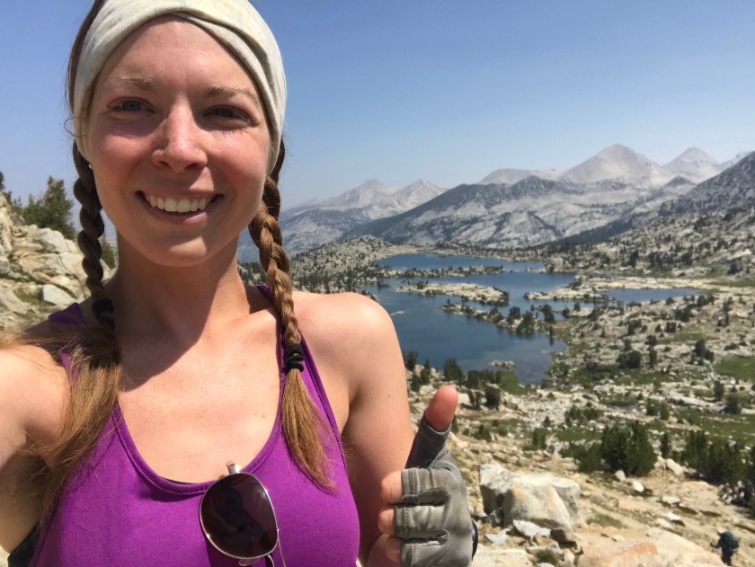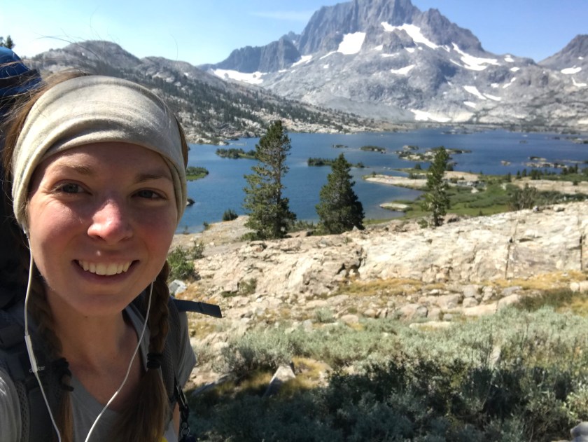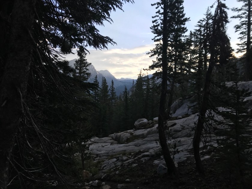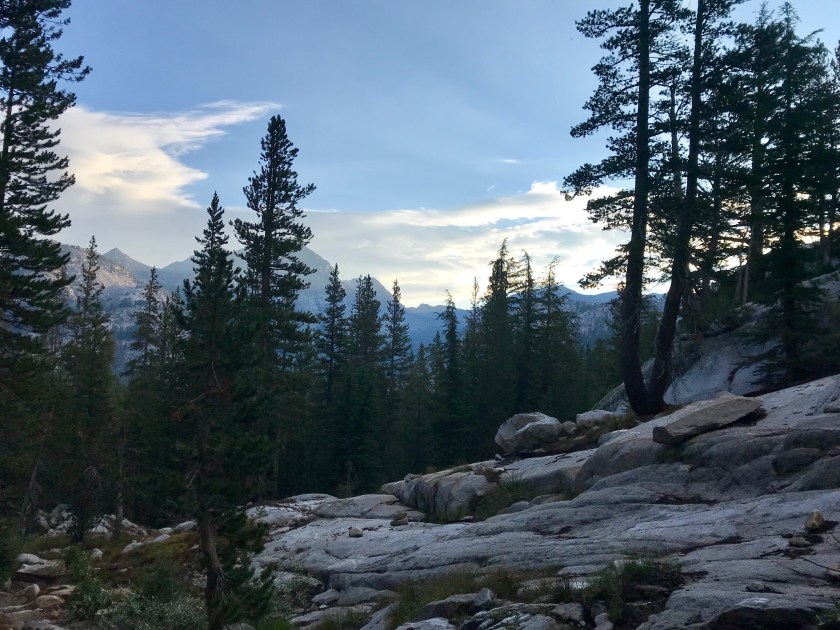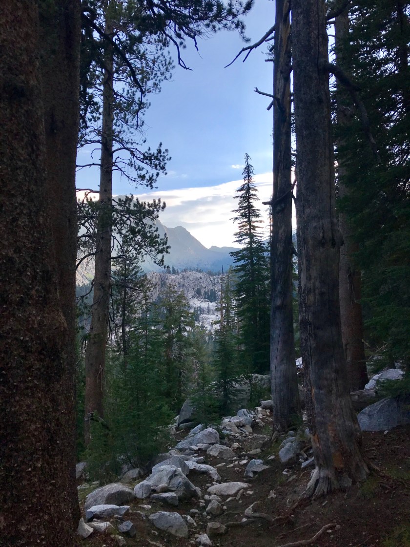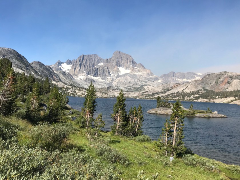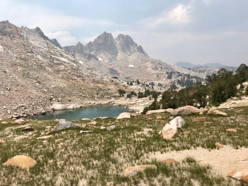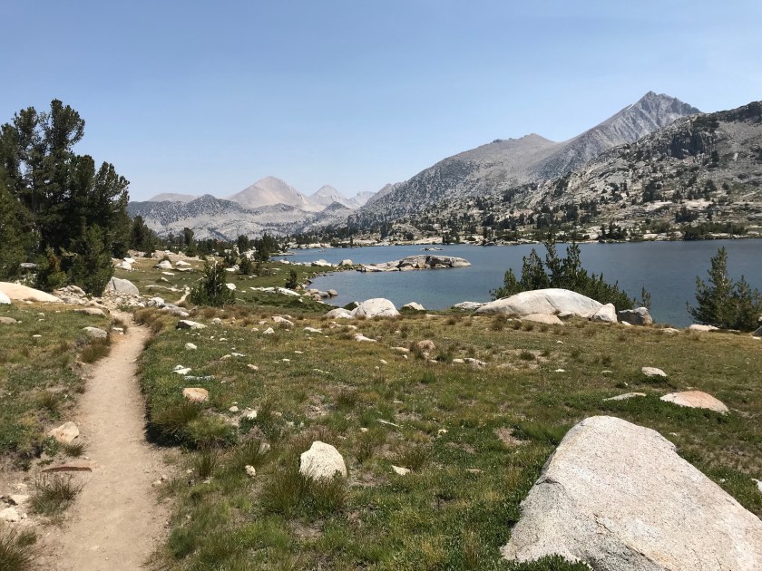 But I forced it to, as I have been this entire journey.  For the sake of Addie and my mental well being, I had to make it.  The morning started with a beautiful downhill view of the mountains, bathing in the amber glow of the early morning sun.  With a little added haze of the smoke, it looked like a painting.  But soon that downhill turned into a harrowing uphill, complete with switchback after switchback in the sun.  I have grown to absolutely detest switchbacks.  They are long and neverending.  Seeing the top the whole way up is mental torture.  Finally I was at the top and only had a short hike to Virginia Lake.  Yesterday, I toyed around with the idea of going further to stop at Virginia Lake because everyone told me how gorgeous it was.  But after talking with Jeb at Silver Pass and he told me it was a 1500′ climb (now the switchbacks make sense) I decided nope – I put my body through enough.  Plus the lightning storm solidified my decision.