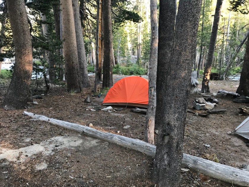 The wind didn’t die down until 6am the next morning, exactly when I wanted to wake up.  Good because I could break down camp in peace, but bad because it didn’t give me a chance to catch up on any semblance of sleep.  But knowing it was likely my last day, I didn’t need sleep.  Plus it’s all downhill to Tuolumne Meadows, so I could practically sleepwalk and be okay. And my bear canister took the wind beating well – it was still standing! The same cannot be said about my tent, however. The poles were bent from the wind. But with it already looking a bit long in the tooth, I personally think the bent poles add even more character to the old beloved Marmot tent.