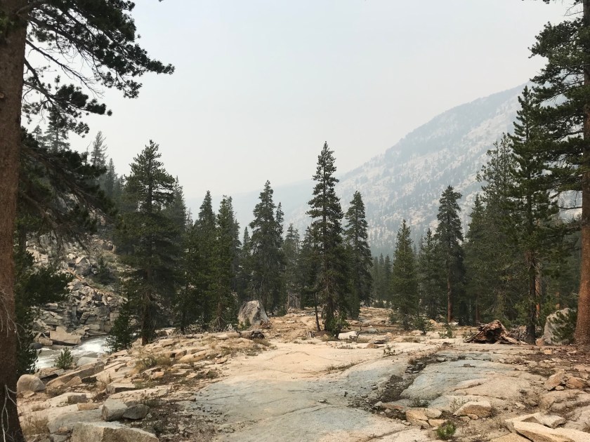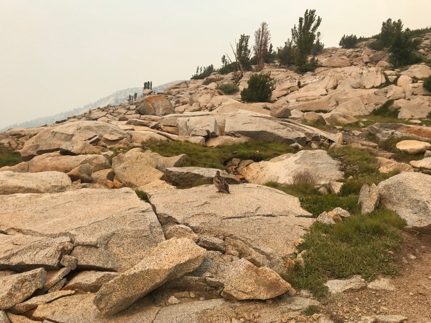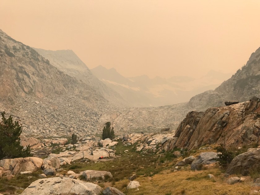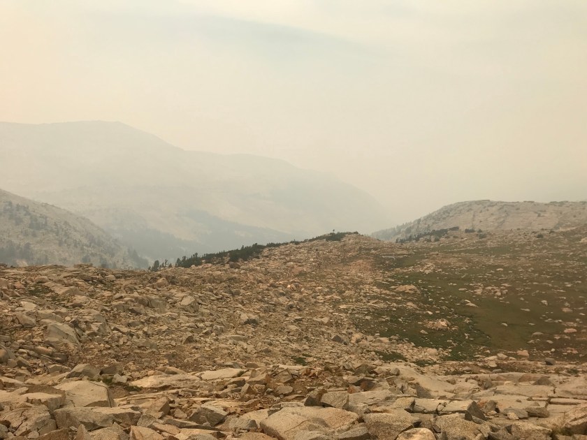 During the climb, I had a little blimp of cell service and told my parents that the smoke was gone! Hooray! They don’t have to worry (my mom even sent a picture of Addie in a mask, no doubt showing support).  As soon as I lost reception, the winds picked up and guess what it blew in?! Within minutes, the canyon was full of thick smoke, obscuring any view of my surroundings.  Great. I’ve been looking forward to Donahue Pass for weeks and now I won’t be able to see anything! Oh well, life’s unfair sometimes.