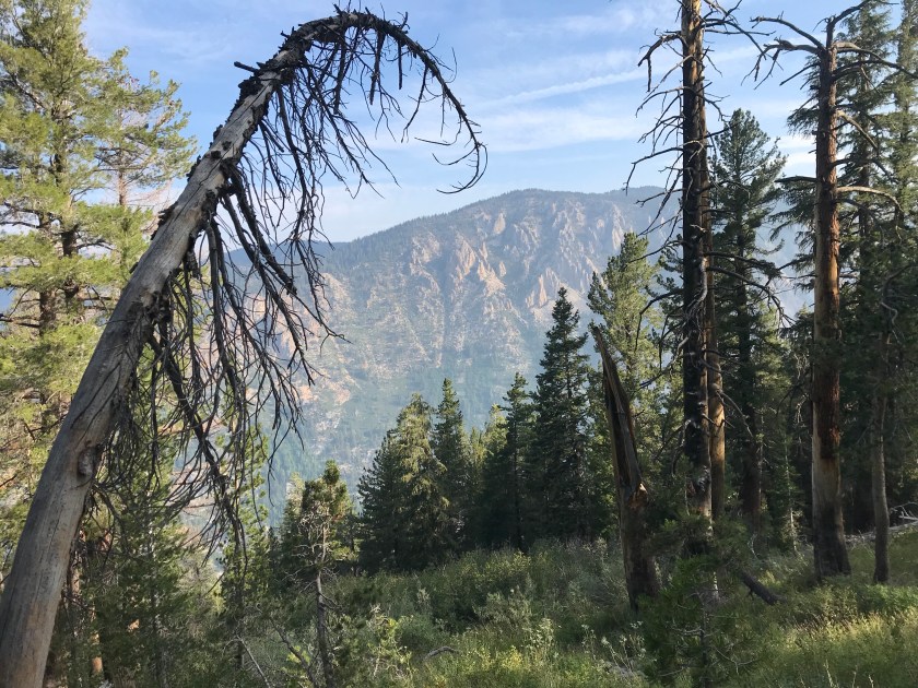 The smoke was the worst it’s been yet today.  As I learned on the Pacific Coast bike tour, winds out here tend to blow from the North down to the South.  Seeing as any of the fires are North of here, the wind is blowing the smoke right our way.  A cowboy leading a mule train told me, “howdy Ma’am, welcome to the most beautiful part of the trail!” News to me, I can’t see anything through the haze of the smoke!