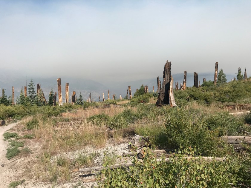 Speaking of smoke, all day it was a very ominous presence, causing an eerie feeling amongst the dead trees I’m still hiking through.  However, it hasn’t really bothered me or affected my breathing.  Someone at Red’s gave me an N95 mask, however, I haven’t had to use it yet.  And not that I’m really planning on using it – it makes breathing harder, especially when hiking uphill.