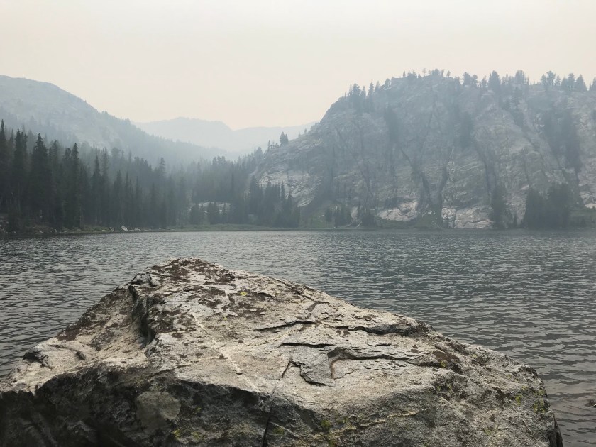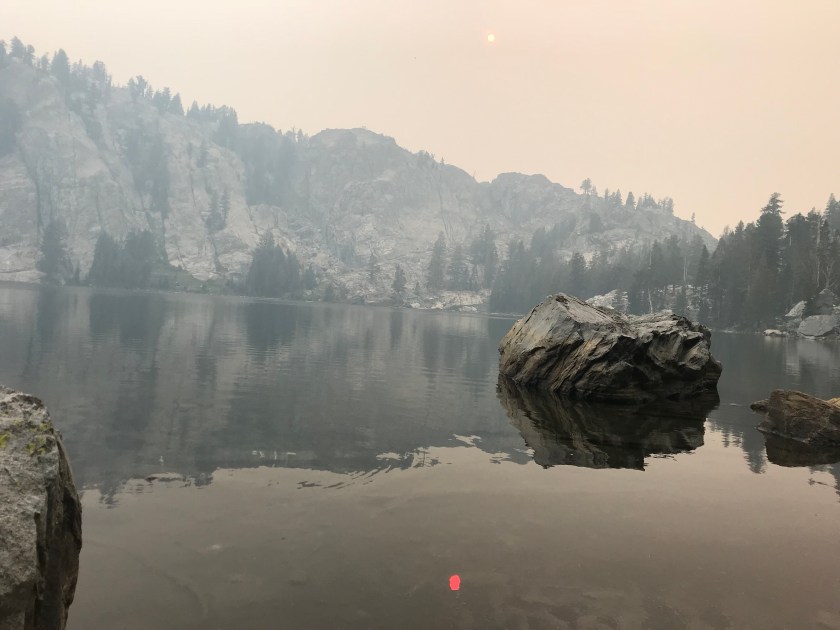 Where I am camping tonight has been an issue of internal debate for the last couple of days.  Originally, I was supposed to stay at Rosalie Lake.  But that’s only 9 miles from Red’s Resort, and I wanted to go a little further to make it to Tuolumne by Sunday.  The problem with going further is there is no reliable water. Jen Warned me of that and gave the recommendation of staying at Rosalie Lake.  When I asked the guys their opinion, they agreed.  They told me to just take it easy, what’s the rush? I wasn’t sold until I actually got to the lake.  It’s beautiful, possibly my favorite late yet! I fell in love immediately and knew I had to stay here for the night.  I found the most perfect camping spot and an even better writing rock! The only problem is that it’s pretty windy and smoke is starting to settle right in the lake.