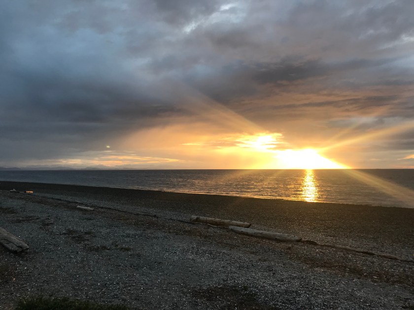 We’re staying at a state park in Birch Bay, and it’s extremely gorgeous. Due to the threat of rain and being the only ones in the campground, we decided to camp under a pavilion. It was perfect! We had dinner and set everything up. But wait, Not so fast! Here comes ranger Rick saying we couldn’t camp there and told us to move. Here it is, 9 at night, pitch dark, all of our stuff set up, and we had to move it. Not only up a huge steep hill, but now in the rain. Rules are rules and we did it without complaining, but man would it be nice to not have to break down a wet camp in the morning. Oh well.