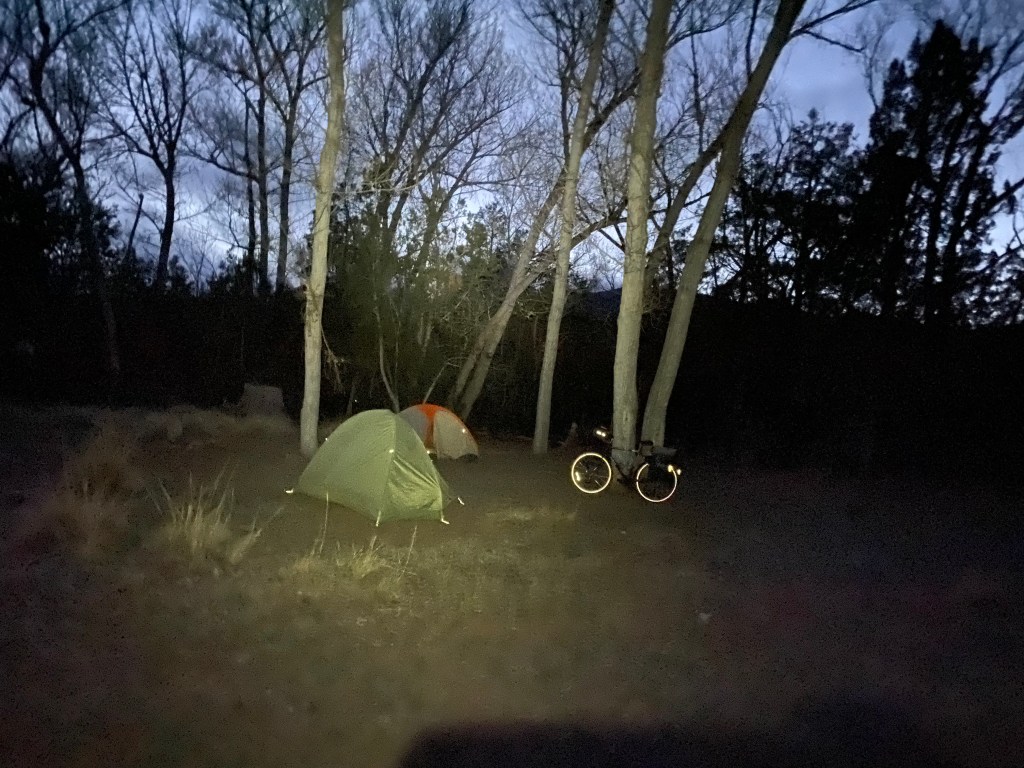 We had 23 miles to worry about it, but arrived at 5:30 to a very nice camp host, Shane, who said we could stay in the group site since it wasn’t booked. Thank goodness he took pity on two very tired bikers.