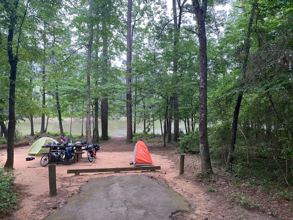 New Waverly is definitely as close to a living ghost town I’ve seen. With lots of old abandoned storefronts but a bustling population, it was a weird juxtaposition. We hung out at the extremely busy grocery store for 2 hours as Sheena fixed her bike. We talked to a number of residents curious about our trip. One of whom was Tristan, a 21 year old originally from Tennessee. He was wearing a Philadelphia Eagles shirt and is an avid fan, despite being in Cowboy country. “Yeah I went to a Cowboys game once, it was during a tornado warning and I didn’t even see one touchdown” Ba-da-ching! He just graduated high school in 2020 and was proud that he was the only one in his class who was old enough to drink alcohol at graduation. He walked 5 miles to work everyday and was very proud of his physique and tan. He got out of Tennessee because there were too many exploding meth labs in his neighborhood (one of which nearly killed him), and he unfortunately ran with a bad crowd in TX. He was incarcerated for 34 weeks for attempting to blow up the Post Office, an offense he claims he was framed for. Quite the character, Tristan had a little too much energy and could’ve gone on for hours talking to us, but it was getting late and we had to pry ourselves away.