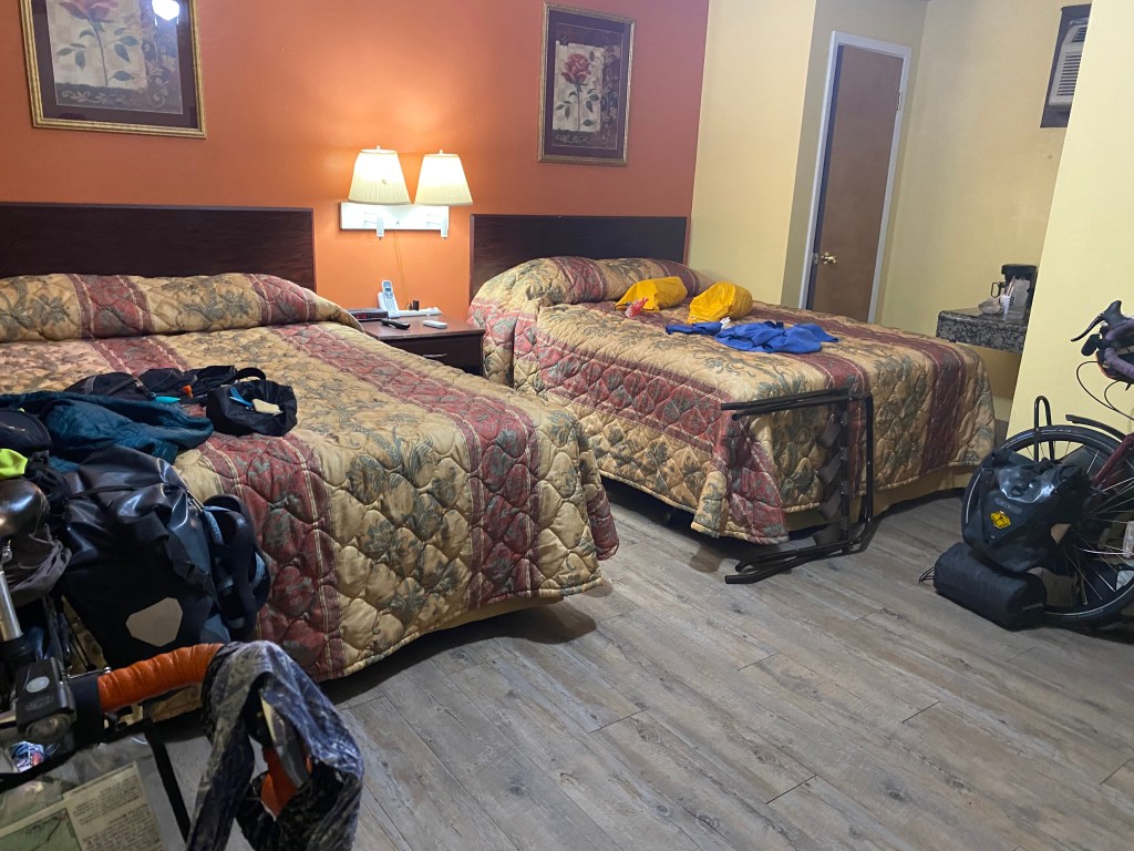 With barely any sleep for either of us, we got up unscathed and happy to see the bleak morning light, surely causing the rabid beasts to retreat back into their dens. We got coffee at a gas station and went on our way to Kountze, where a hotel was waiting for us. Bad weather was predicted for this afternoon and after the night we had, we didn’t want to be caught in a raccoon ravaged tent during a tornado.