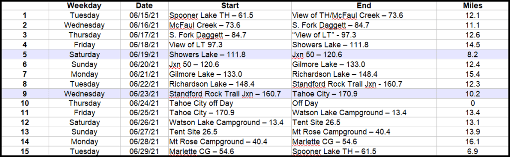 So how long will this endeavor take? With all the time in the world, we can take it as slowly as needed. Not wanting to overtax Addie, I wanted to keep our days relatively short. I didn’t want to average more than 12 miles/day to keep her joints, paws, and mind all healthy. With special attention to water sources, I was able to achieve this mileage goal with 5 days between re-supplies and one rest day in Tahoe City. Of course, with any hike, itineraries are subject to change but I’m pretty happy with this schedule.