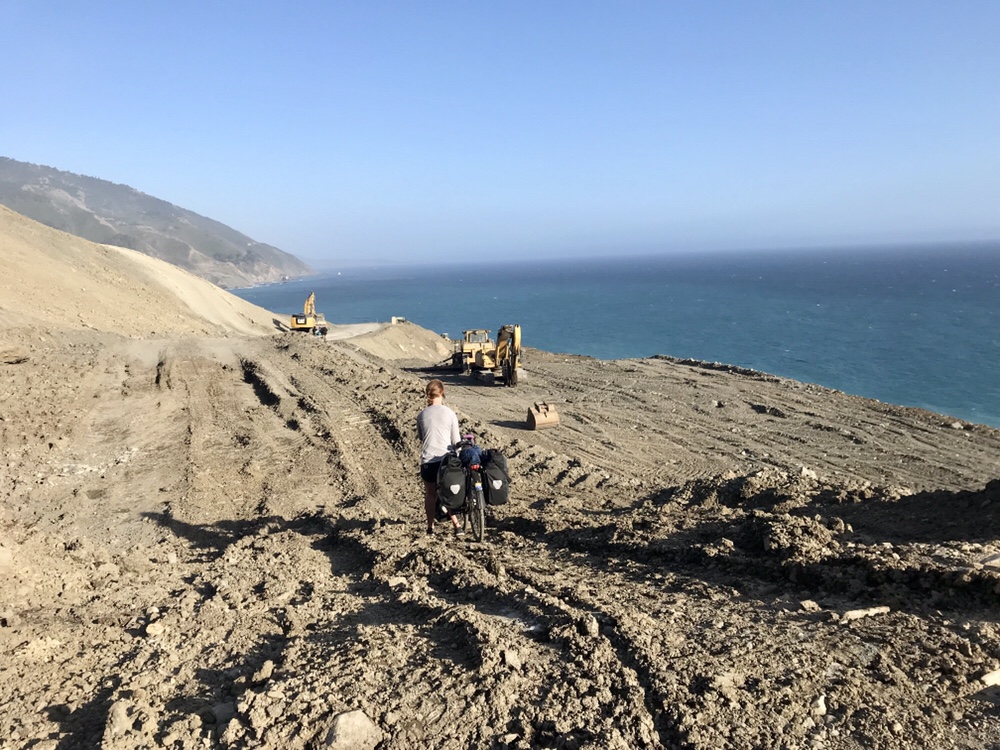 Now we are not making this decision lightly or without doing a ton of research. With knowledge that the highway was still closed since the beginning of the trip, we’ve been asking all our warm shower hosts and other cyclists ahead of us for any information possible on crossing the slide. First and foremost – is it safe? The answer we got is “yes, but it is illegal”. Okay, great, what are the chances of getting caught? None – once the construction boss leaves at 5:30pm, the road is yours. Literally no one cares if you cross it. We heard rumors that there was a sheriff patrolling the slide issuing fines, but those were proven false. It’s a scare tactic to dissuade cyclists from crossing. And that tactic almost worked on us. After speaking with a couple who crossed 2 nights ago safely as well as the owner of the restaurant right before the slide where we’re eating dinner waiting for the foreman to leave, we feel confident with our decision to cross the 1/2 mile of slide safely. Otherwise we wouldn’t do it! I’m sure it doesn’t come without danger – sliding into the pacific is a true risk and rock slides are an ever present concern in this area. But without rain the last 2 weeks and no wind to speak of today, we feel nothing but confidence going forward. We even talked to some of the construction crew at dinner, who pretended they didn’t know what we’re about to do, but cheered us on anyway.