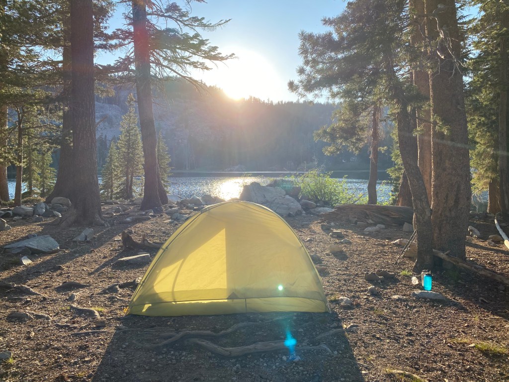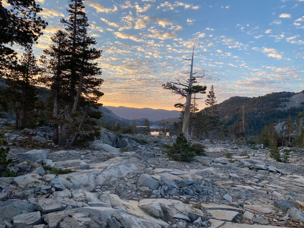 Eventually I made it into Desolation Wilderness, a part of the trail I was really looking forward to as everyone raves of its beauty. I’m really happy Addie isn’t here for it. The terrain is sharp and rocky, surely injuring her delicate little feet since she refuses to wear her booties! Now let me tell you desolation did not start off and on a good foot. Between the rocks, my tired legs, my rumbling belly, bloodthirsty swarming mosquitoes, and the sun setting right in my face, I must’ve look like I just finished 60 mimosas. I was so frustrated that I’m sure I scared any bears away with my clumsy stumbling and frustrating yells. But alas, at 7 PM, I made it to the Tamarack Lake. With just enough sunlight to eat and set up camp, I’m ready to just pass out to the humming of a million mosquitos.